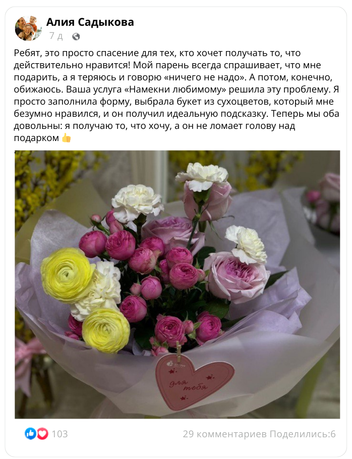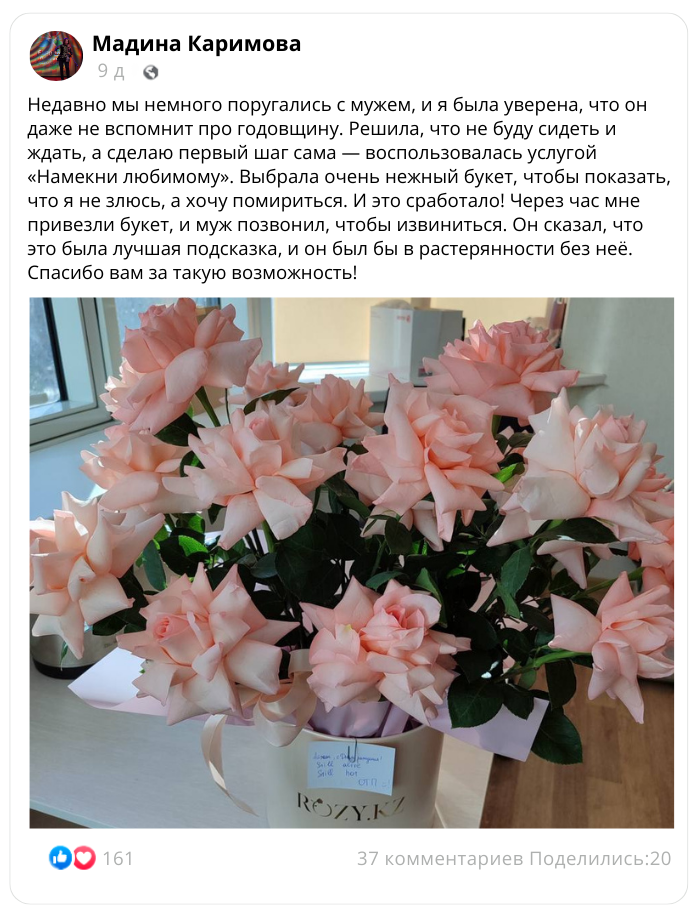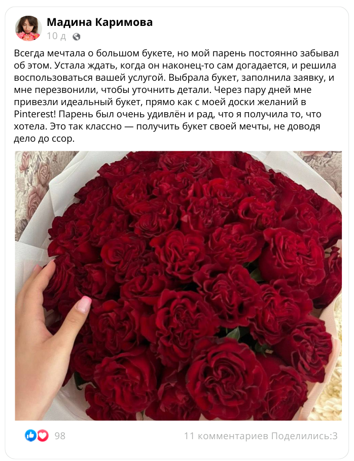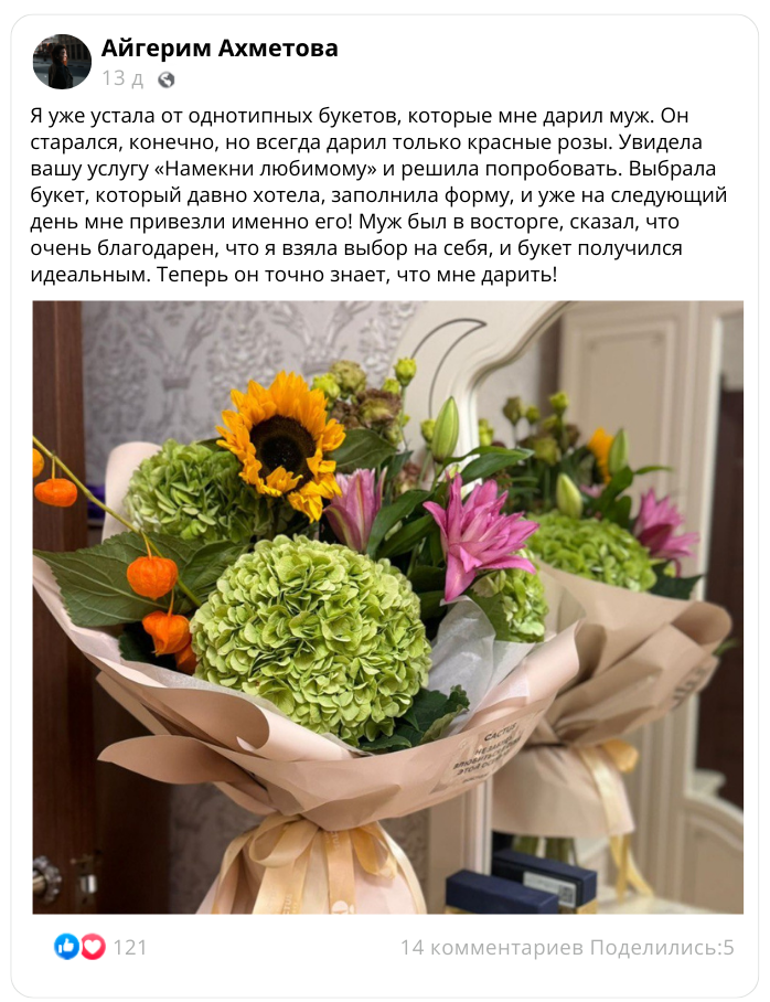 Деликатный разговор мы берём на себя: находим правильные слова и мягко объясняем, что вас можно порадовать цветами.