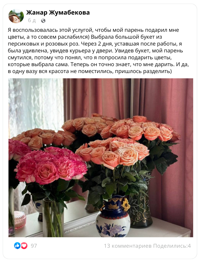 В назначенный день курьер приносит букет лично вам — как приятный знак внимания от любимого.